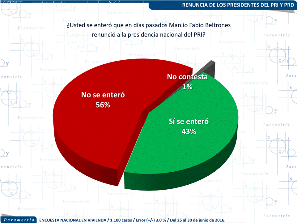 Cuatro de cada diez mexicanos (43%), dijeron estar enterados de la dimisión de Manlio Fabio Beltrones como presidente nacional del PRI, mientras que 56% no tuvo conocimiento del hecho. El sonorense que cuenta con una amplia trayectoria en dicho partido, ejerció el cargo menos de un año, pues fue nombrado el 20 de agosto de 2015.