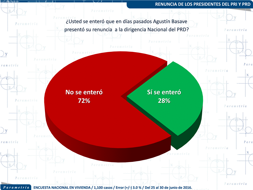 En tanto, Agustín Basave, ex presidente nacional del PRD, presentó su renuncia al cargo el pasado 18 de junio. Este hecho tuvo un bajo conocimiento por parte de los mexicanos, 7 de cada 10 personas (72%) dijo desconocer la salida del académico. Basave asumió el cargo el 07 de noviembre de 2015, y había manifestado en otras ocasiones su intención de renunciar al mismo.