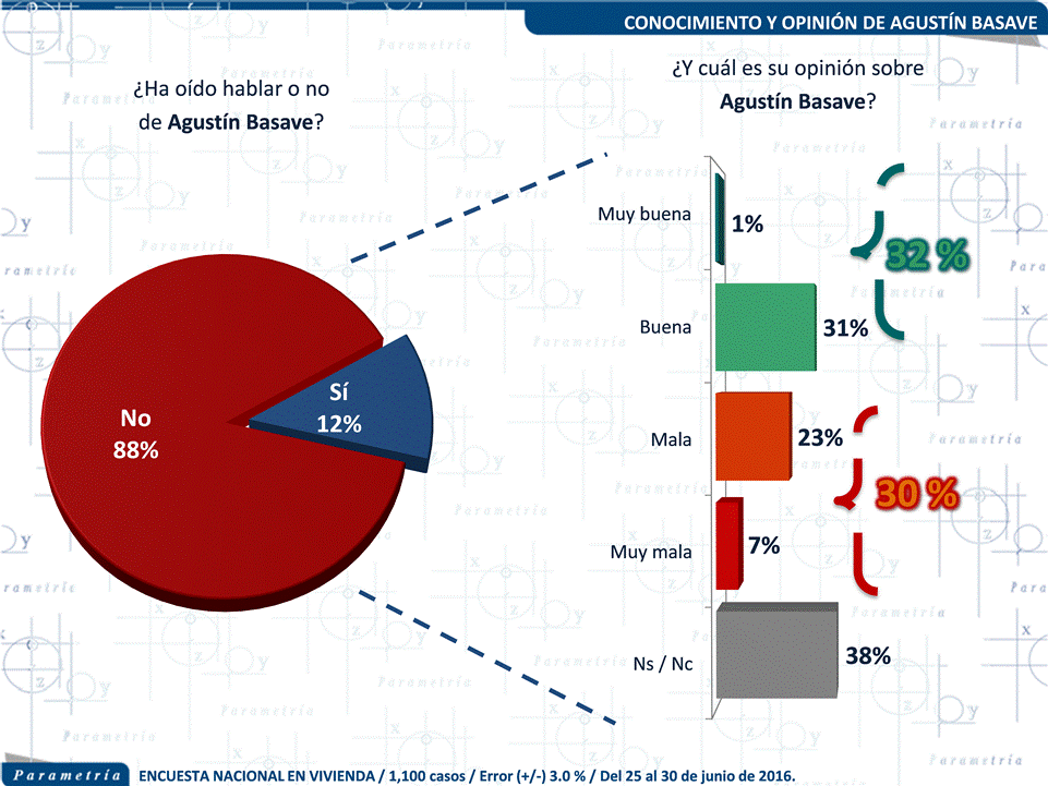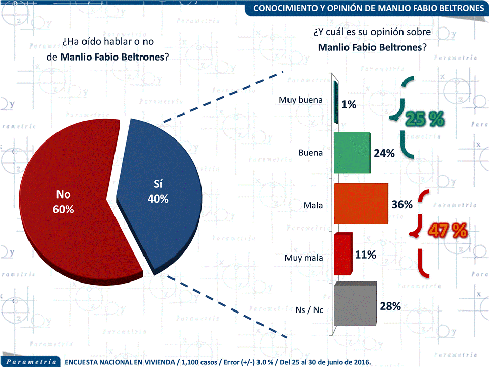 PARAMETRÍA.Encuesta en vivienda. Representatividad: Nacional. Número de entrevistas: 1,100 encuestas realizadas del 25 al 30 de junio de 2016. Nivel de confianza estadística: 95 %. Margen de error: (+/-) 3.0 %. Tasa de Rechazo: 29%. Diseño, muestreo, operativo de campo y análisis: Parametría SA de CV. Método de muestreo: Aleatorio sistemático con probabilidad proporcional al tamaño. Unidad de muestreo: Las secciones electorales reportadas por el INE. Población objetivo: Personas de 18 años en adelante con credencial para votar que al momento de la entrevista residan en el lugar de interés.
