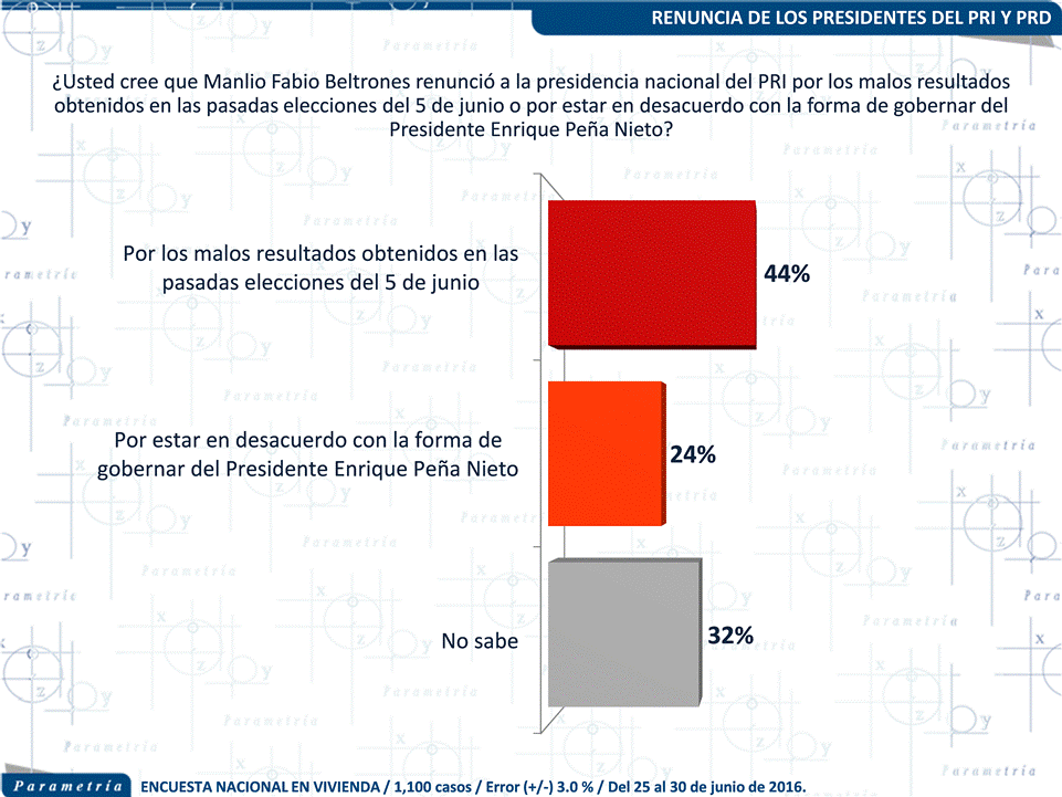 En la opinión pública, el 44% de los entrevistados piensa que la dimisión del ex dirigente nacional se debió al argumento oficial del partido: los malos resultados obtenidos en las pasadas elecciones. Por otra parte un 24% cree que Beltrones dejó el cargo por estar en desacuerdo con la forma de gobernar del Presidente Enrique Peña Nieto. Llama la atención que un tercio de los mexicanos (33%) dicen no saber el motivo de la renuncia.