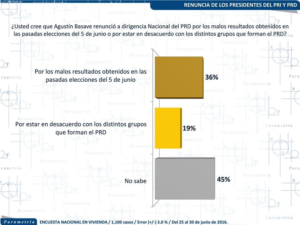 De acuerdo con los datos de Parametría el 36% de los mexicanos piensa que la salida de Basave se debió también a los resultados obtenidos en las elecciones del 5 de junio. Sólo 2 de cada 10 personas (19%) cree que el perredista renunció por los desacuerdos entre los distintos grupos que forman el PRD, el motivo oficial de su dimisión. Es importante mencionar que casi la mitad de los entrevistados (45%) desconoce el motivo de la renuncia del ex presidente del PRD.