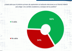 Asimismo, una proporción similar (58 %) de entrevistados afirmó saber la razón o para qué se eligen estos organismos ciudadanos. Sólo el 42 % admitió desconocer que los comités y consejos tienen funciones como integrar, analizar y promover las soluciones a las demandas de los vecinos de su colonia. Así como de proponer proyectos de desarrollo comunitario al gobierno del Distrito Federal[4].