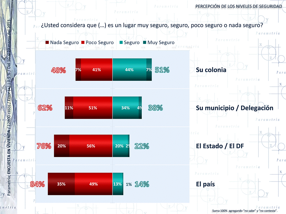 A medida que crece el territorio, aumenta la percepción de inseguridad entre los mexicanos, por ejemplo, seis de cada diez dijeron que su municipio era un lugar poco o nada seguro, opinión que compartieron 76% respecto a los niveles de seguridad en los estados. A nivel país, un 84% señaló que lo consideraba como un lugar nada o poco seguro sólo 14% opinó lo contrario.