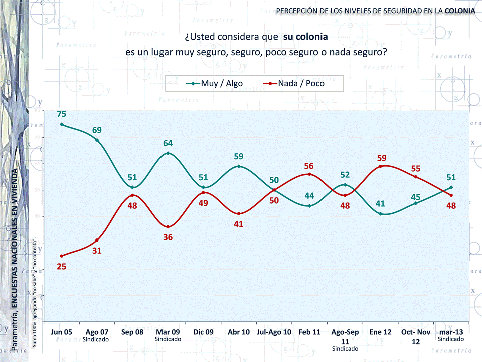 De acuerdo con la serie histórica de Parametría, desde enero de 2012, no se presentaban porcentajes arriba del 50% en las opiniones que consideraban a su colonia como un lugar muy seguro o algo seguro.
