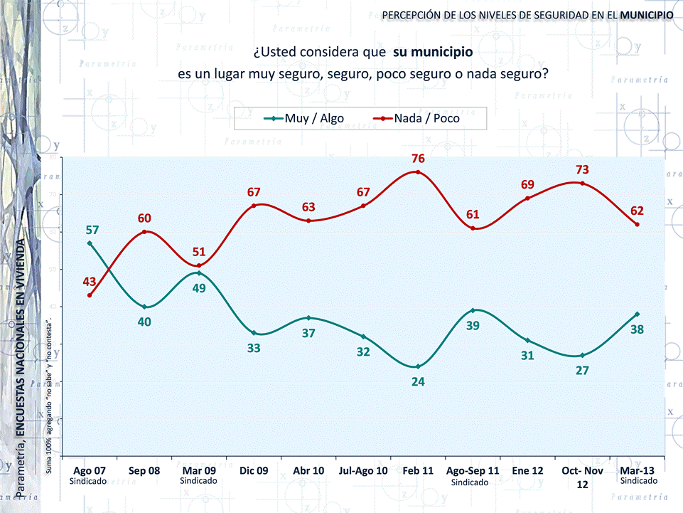 Los municipios a diferencia de las colonias, han sido concebidos como espacios mayormente inseguros desde 2008, cuando seis de cada diez entrevistados así lo reportaron, la cúspide de estas opiniones se presentó en febrero de 2011, en esta fecha casi ocho de cada diez (76 %) afirmaron que su municipio era un lugar poco o nada seguro. En la medición de marzo de 2013 sólo 38% dijo que su municipio era seguro, sin embargo, existe una reducción de once puntos en esta percepción en contraste con lo registrado en noviembre del año pasado.