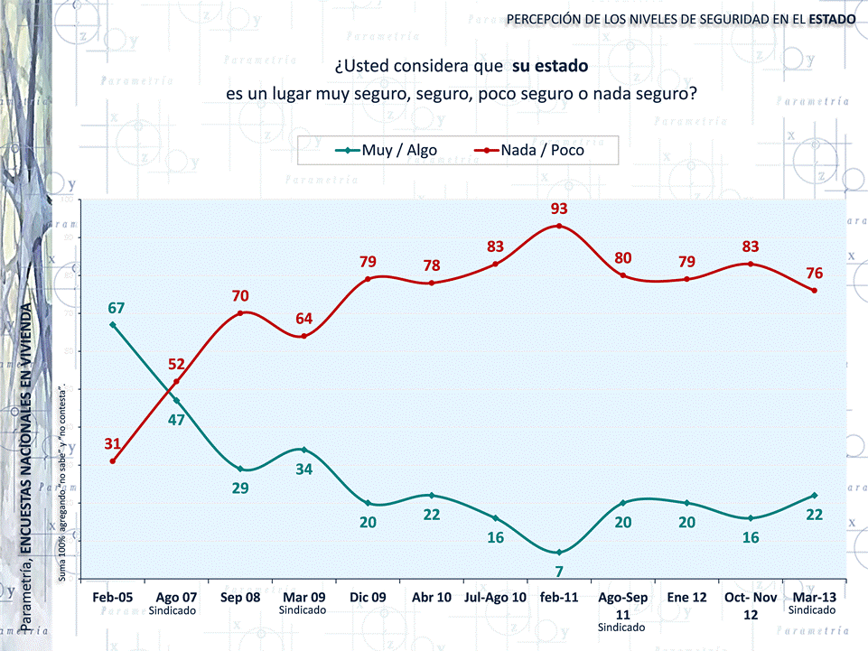 La percepción de inseguridad en los estados ha oscilado de 52% a 93% en un lapso de seis años, (2007 a 2013) el nivel más elevado de personas que consideraban su entidad federativa como un lugar poco o nada seguro se registró en febrero de 2011, cuando 93% así lo indicó, a un mes de finalizar el periodo de gobierno de Felipe Calderón sólo 16% de los mexicanos consideraba algo seguro o muy seguro su estado, de esa medición a la realizada en marzo de 2013 se registró un aumento de seis puntos que hablaban de entidades federativas seguras.