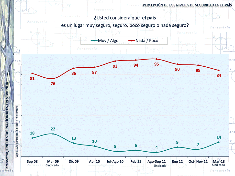 En cuanto al país, la percepción de inseguridad ha fluctuado de 76% a 94%, casi la totalidad de mexicanos considera que México es un país nada o poco seguro, en septiembre de 2011 se registró el menor porcentaje de personas que apoyaron la idea de que vivían en un país seguro, apenas 4% así lo refirió, sin embargo, de noviembre de 2012 a marzo de 2013 observamos un repunte de siete puntos en la opinión de que somos un país seguro.