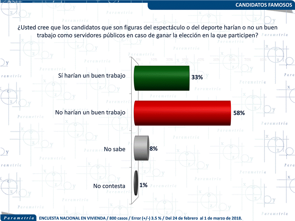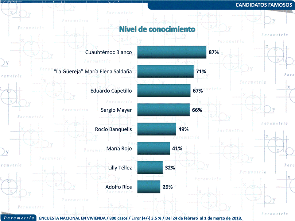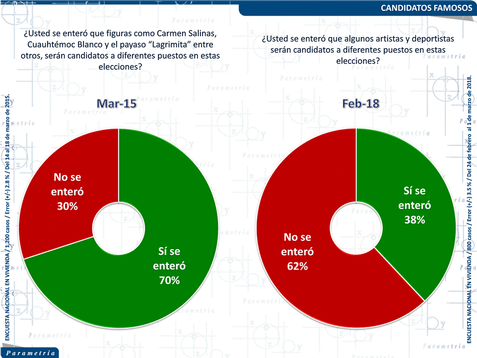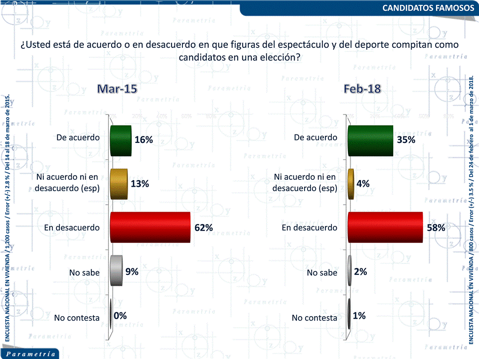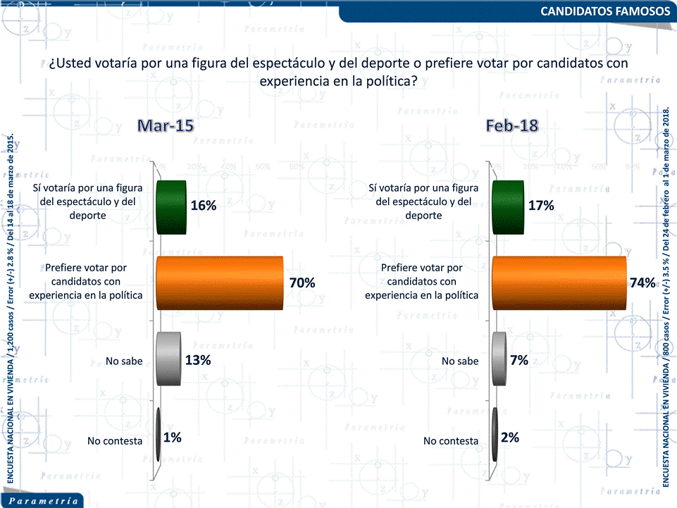Parametría. Encuesta en vivienda. Representatividad: Nacional. Número de entrevistas: 800 encuestas realizadas del 24 de febrero al 1 de marzo de 2018. Nivel de confianza estadística: 95 %. Margen de error: (+/-) 3.5 %. Diseño, muestreo, operativo de campo y análisis: Parametría SA de CV. Método de muestreo: Aleatorio sistemático con probabilidad proporcional al tamaño. Unidad de muestreo: Las secciones electorales reportadas por el INE. Población objetivo: Personas de 18 años en adelante con credencial para votar que al momento de la entrevista residan en el lugar de interés.