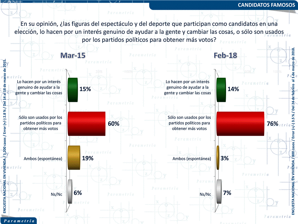 La mayoría de mexicanos (76%) consideran que las figuras del espectáculo y del deporte sólo son usados por los partidos políticos para obtener más votos, pocos son los que piensan que este tipo de postulaciones tienen como fin un interés genuino de ayudar a la gente y cambiar las cosas. De 2015 a 2018 ha crecido el porcentaje de quienes creen que estas postulaciones son una estrategia electoral para conseguir apoyos al pasar de 60% a 76% quienes así lo señalaron.