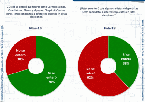 Probablemente el porcentaje de conocimiento de la postulación de estas figuras crecerá en los próximos días, pues han iniciado ya las campañas políticas, sin embargo, si se observa un porcentaje menor de atención en el tema en comparación con el proceso pasado.