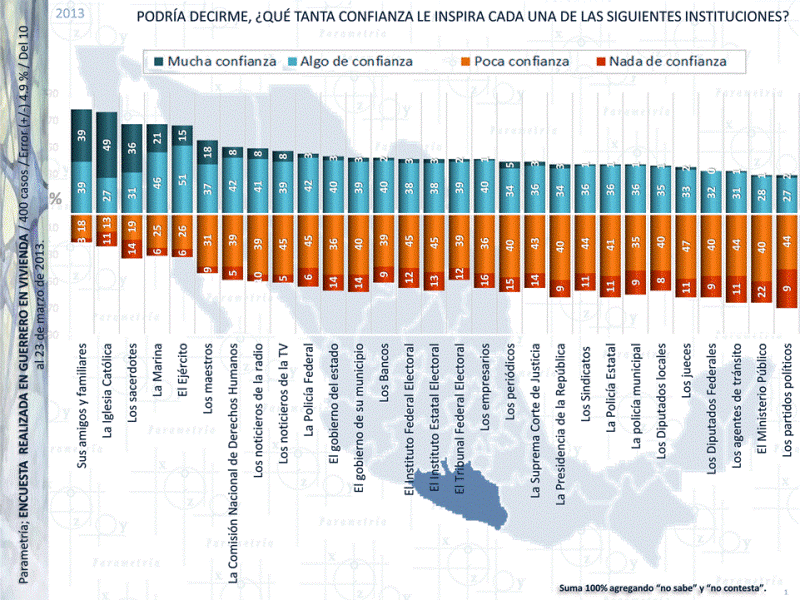 El estudio Sindicado 2013, elaborado por Parametría —encuestas que se realizan en vivienda en todos los estados del país—muestra que existen pocas instituciones en las que confían los guerrerenses. Este es un primer dato sobre la percepción pública de las instituciones gubernamentales. Siete de cada diez entrevistados en dicho estado, dijo tener “mucha” o “algo de confianza” en sus amigos y familiares, la iglesia, los sacerdotes, la Marina y el Ejército, siendo las instancias mejor posicionadas.