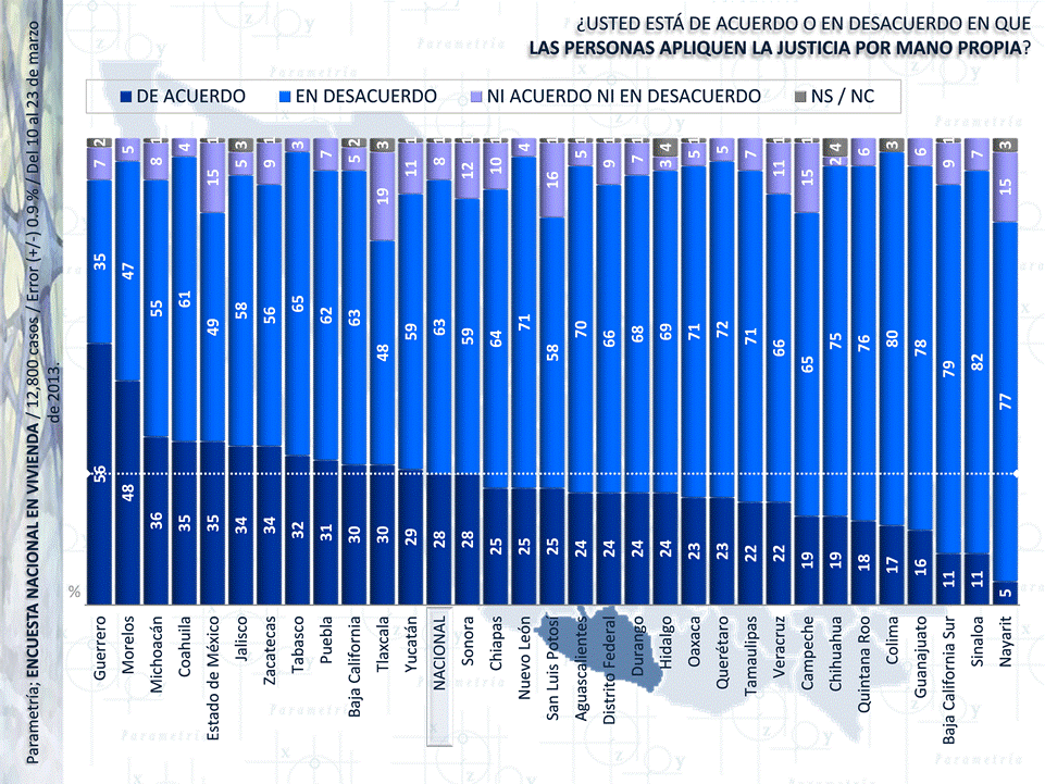 El estado de Guerrero es donde observamos que más ciudadanos (56 %), consideran que las personas deben aplicar la justicia por su propia mano, seguido por Morelos (48 %), Michoacán (36 %), Estado de México y Coahuila (ambos con 35 %). La media nacional indica que 28 % de los entrevistados en México acepta este tipo de justicia, contra 63 % que la rechaza.