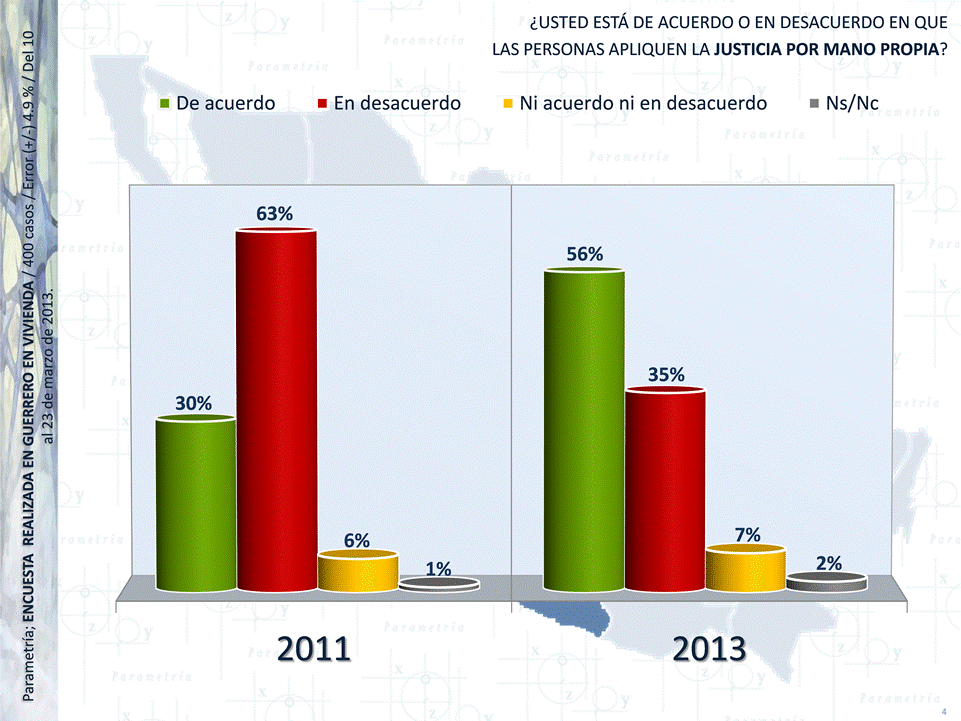 Además, llama la atención que en el caso de Guerrero, el porcentaje de ciudadanos que están de acuerdo con que las personas apliquen la justicia por mano propia ha aumentado casi dos veces desde el año 2011 (30 %). Ahora más de la mitad de los habitantes de esta región (56 %) comulgan con esta forma de justicia.