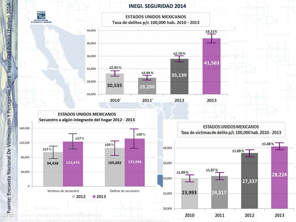 De acuerdo con el Inegi. el 33.9% de los hogares registró al menos una víctima de delito en 2013. Existe una tasa de victimización de 28 mil personas por cada 100 mil habitantes. La cifra negra el año pasado llegó a 93.8%, y el 73% de los mexicanos se siente inseguro en su estado. El costo estimado como consecuencia de la inseguridad asciende a 213 mil millones de pesos, lo que presenta el 1.27% del Producto Interno Bruto.