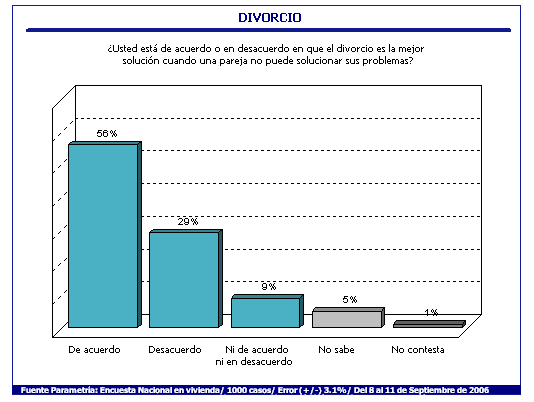 De acuerdo con la última Encuesta Nacional en Vivienda de Parametría, para un 56% de los ciudadanos el divorcio es lo mejor cuando los problemas maritales son irresolubles, mientras que el 29% está en desacuerdo con la separación legal y 9% tiene una posición neutral respecto al tema.