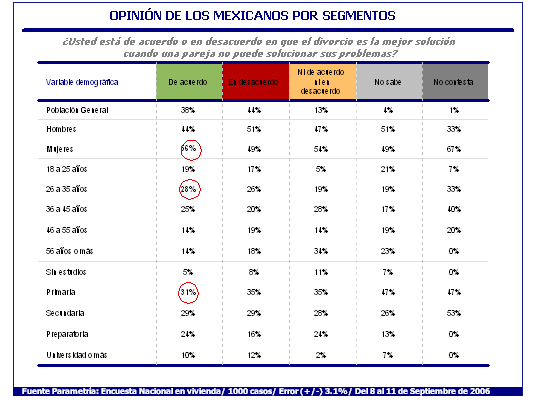 Al analizar la opinión de los mexicanos por segmento se aprecia que son las mujeres las que aprueban en mayor medida el fin de una unión tormentosa (56%). El divorcio es más aceptado por personas de entre 26 y 35 años de edad y que cuentan con un nivel de escolaridad bajo (primaria).