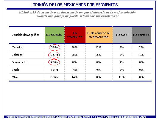 Según el estado civil, el 53% de los mexicanos casados está a favor de la separación ante la imposibilidad de resolver los problemas de pareja, posición que comparte el 65% de los solteros y el 79% de los divorciados. Esto significa que -en especial- la mayoría de los divorciados se encuentran convencidos de la decisión que adoptaron.