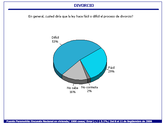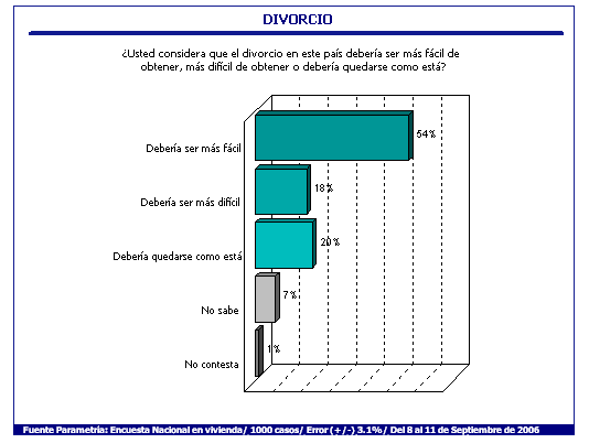 Incluso en la mayoría de los casos (54%), la ciudadanía considera que el proceso legal para terminar la relación marital debe ser más sencillo, el 20% cree que tiene mantenerse inalterable y el 18% piensa que debe de ser más complicado.