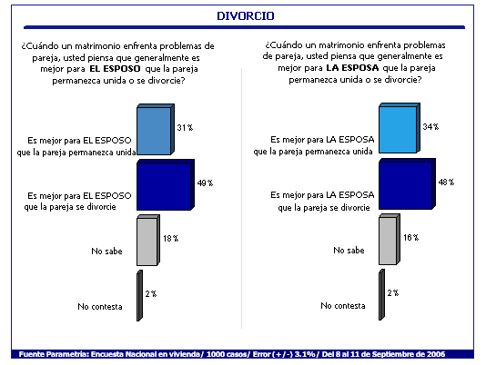 La mayoría de las mexicanos ve en el divorcio una salida adecuada cuando se han agotado otros caminos paras solucionar los problemas en el matrimonio, en tanto que casi un tercio de la población reprueba el fin de los vínculos nupciales, segmento en el cual son más lo hombres que se resisten a acabar con la relación.