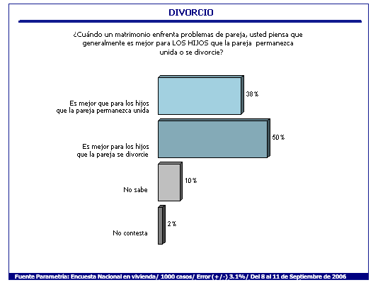 El tema del divorcio es centro de un permanente debate por las implicaciones que tiene, no sólo para la pareja sino para los hijos en su caso. De acuerdo con el 50% de la población, lo más saludable para los hijos de una pareja en conflicto es la separación, ante la opción de seguir unida cuando enfrenta problemas de manera reiterada.