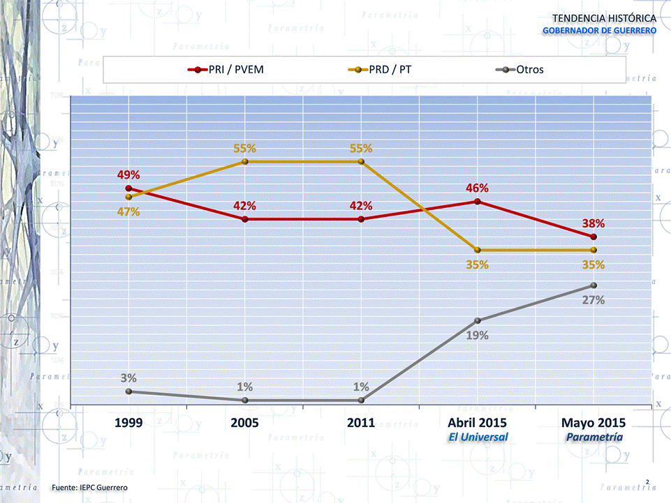 A diferencia de lo que pasa en otros estados, donde la elección actual se asimila a comicios anteriores, en Guerrero se observa una inercia distinta. Los dos partidos que han sido dominantes en el estado, PRI y PRD, han perdido la simpatía de los electores, hecho que se acentúa más en el caso del PRD. Quienes se han beneficiado de este descenso son los otros partidos, que de acuerdo con la última medición que realizamos concentran ya el 27 % de la votación.