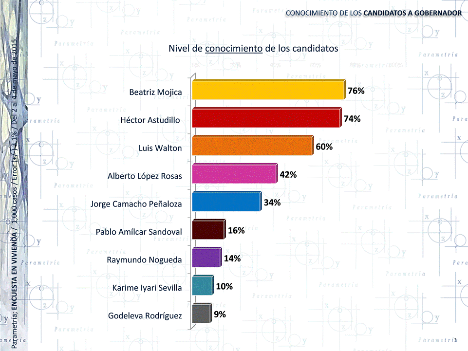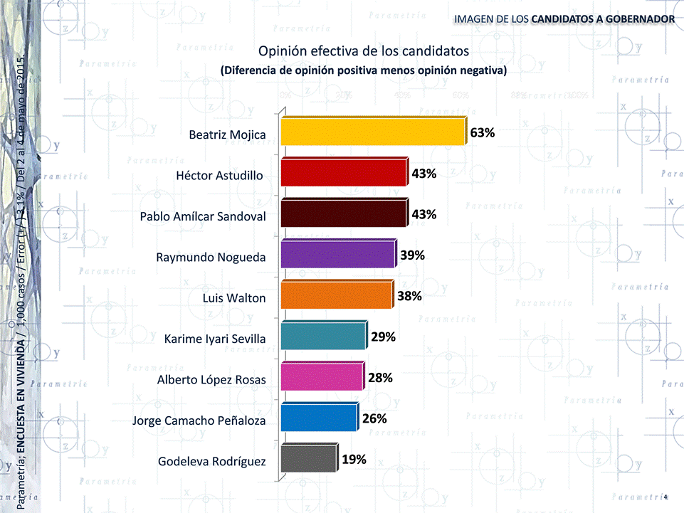 PARAMETRÍA. Encuesta en vivienda. Representatividad: Estatal. Número de entrevistas: 1,000 cuestionarios hechos a personas de 18 años en adelante con credencial para votar que residan en el lugar de interés al momento de la entrevista. Fecha de levantamiento: 02 al 04 de mayo de 2015. Tasa de Rechazo: 8 %. Nivel de confianza estadística: 95 %. Margen de error: (+/-) 3.1 %. Diseño, muestreo, operativo de campo y análisis: Parametría SA de CV. Método de muestreo: Aleatorio sistemático con probabilidad proporcional al tamaño. Unidad de muestreo: Las secciones electorales reportadas por el INE.