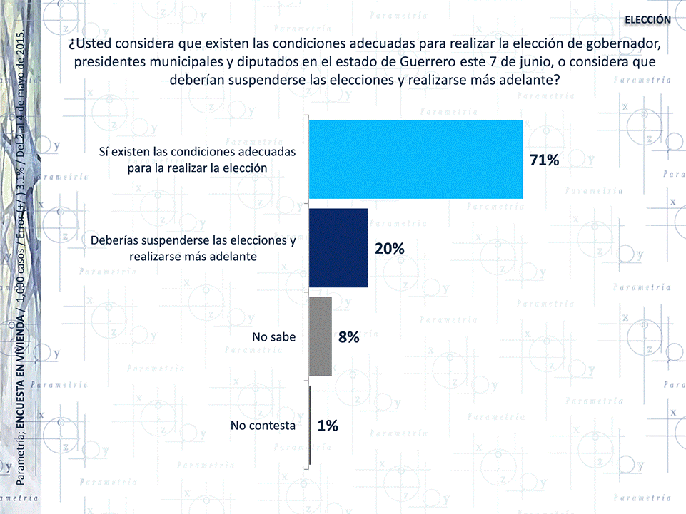 Sin embargo, el discurso de estos grupos no coincide con lo que opina la mayoría de personas en la entidad. Para siete de cada diez guerrerenses sí existen las condiciones adecuadas para realizar la elección de gobernador, presidentes municipales y diputados en el estado de Guerrero este 7 de junio. Si bien un 20 % de los encuestados considera que los comicios deben suspenderse y realizarse más adelante, para la mayoría deben realizarse.