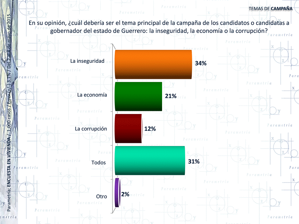 La inseguridad es considerada para más guerrerenses como el principal tema de la elección (34 %), los ciudadanos del estado tienen claro que existe un importante reto en este ramo. En tanto, para 31%, inseguridad, economía y corrupción deben ser los tópicos que ocupen a los candidatos a gobernador.