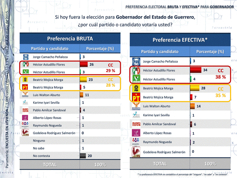 De acuerdo con los resultados de la encuesta estatal realizada en vivienda, en la sexta entrega de El Financiero-Parametría de cara a la elecciones de 2015, Héctor Antonio Astudillo Flores (PRI-PVEM) registra el 38 % de la preferencia efectiva en la elección para gobernador en Guerrero, seguido por Beatriz Mojica Morga (PRD-PT) quien obtiene el 35 %. En tercer lugar aparece el candidato Luis Walton Aburto (Movimiento Ciudadano) con el 14 %, el candidato de Morena, Pablo Amilcar Sandoval Ballesteros, registra 6 % y en un alejado quinto lugar se ubica Jorge Camacho Peñaloza del PAN, quien llega al 3 % de la intención de voto.