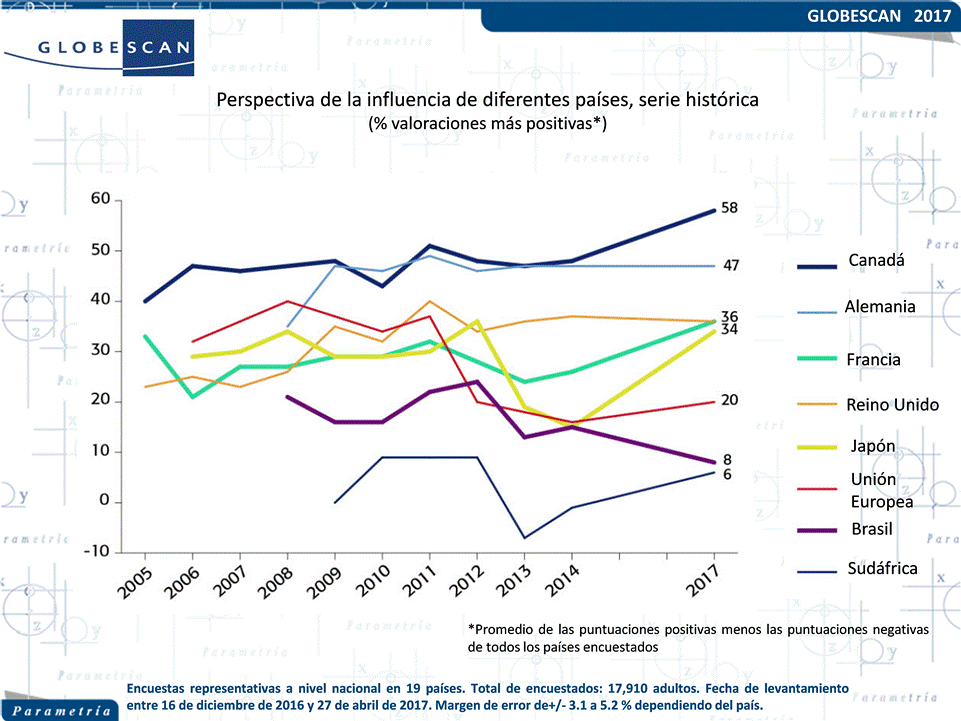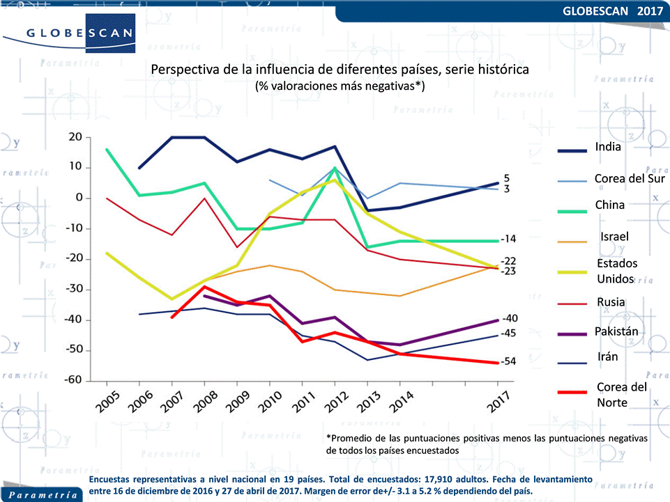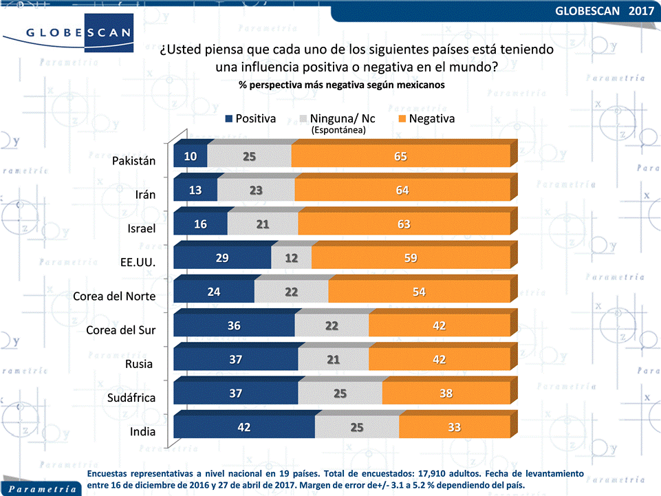 La consultora de opinión pública GlobeScan coordina cada año estudios a nivel mundial sobre diversas materias y problemáticas internacionales. Para 2017, uno de los temas de análisis fue la influencia positiva o negativa que algunos países tienen en el mundo. En la encuesta participaron 19 naciones de los cinco continentes: Australia, Brasil, Canadá, China, Francia, Alemania, Grecia, India, Indonesia, Kenia, México, Nigeria, Pakistán, Perú, Rusia, España, Turquía, Reino Unido y Estados Unidos a quienes se les realizaron las mismas preguntas en fechas similares. En el caso de México el ejercicio fue realizado por Parametría quien colaboró, a través de una encuesta nacional, en proporcionar la opinión de los mexicanos acerca de la perspectiva hacia ciertos países del mundo.
