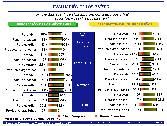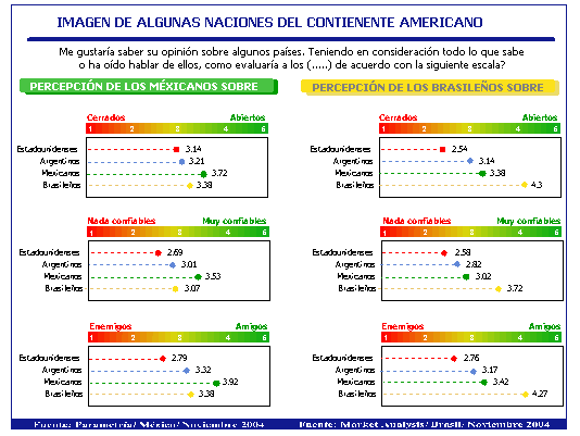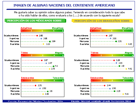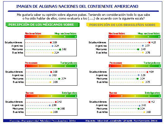 En la encuesta aplicada tanto en México como en Brasil, se pidió a los entrevistados que evaluaran en una escala del 1 al 5 a los estadounidenses, brasileños, argentinos y mexicanos en diversos aspectos. Algunos tienen que ver más con valores internos –simpatía, tolerancia, amistad, etc- y otros tienen una mayor relación con cuestiones externas, tales como desarrollo y riqueza.