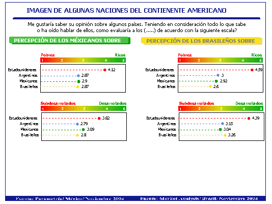 Por otro lado, en el plano económico, los brasileños y mexicanos presentan una actitud más realista de la situación, pues la población de ambos países señaló que los norteamericanos eran los más ricos y desarrollados de todas las naciones que se evaluaron.