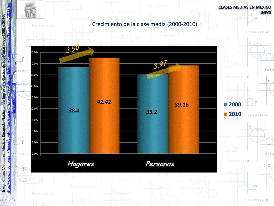 Inegi señala además que en el trascurso de una década, la clase media en el país se incrementó en cuatro puntos porcentuales, ya sea contabilizando hogares o individuos, pasando de 38.4 hogares en 2010 a 42.42 en 2012, y de 35.2 personas hace diez años a 39.16 en 2010.