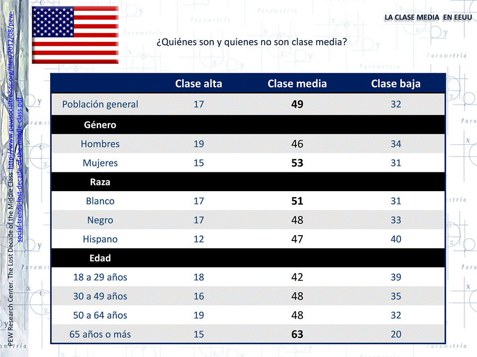 El Instituto de investigación Pew Research Social & Demographic Trends realizó un estudio sobre la clase media estadounidense[3], los datos publicados refieren que la auto identificación como clase media en Estados Unidos tiene una alta correlación con patrones de raza, edad, género e incluso identificación partidista, por ejemplo el 51% de las personas blancas entrevistadas se identificó como clase media, contra 48% de afroamericanos y 47% de hispanos, de igual forma, los adultos mayores de 65 años (63%) son más propensos que cualquier otro grupo a posicionarse como pertenecientes a la clase media, mientras que, aquellos entre 18 a 29 años, son más propensos a decir que pertenecen a la clase baja o media-baja (39%) mientras tanto los hombres norteamericanos (46%) son menos propensos que las mujeres (53%) para incluirse a sí mismos como clase media.