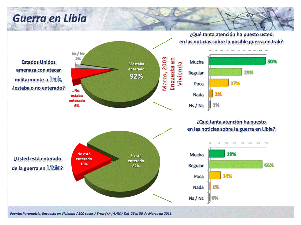 El nivel de conocimiento sobre los eventos anteriores que han ocurrido en los países de Medio Oriente es considerable. En 2003 el 92% de mexicanos se enteraron de la amenaza de EEUU para atacar militarmente a Irak, donde además el 79% de los entrevistados reportó haber puesto regular o mucha atención a las noticias sobre el evento. Para el 2011, la Encuesta Nacional en Vivienda de Parametría realizada en marzo, arrojó datos interesantes sobre la percepción de los mexicanos en los temas de la guerra, y cómo estos han cambiado desde la guerra en Irak.