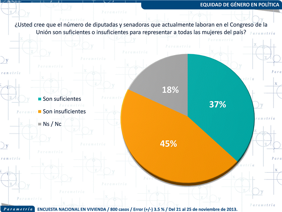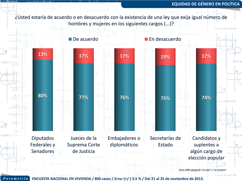 PARAMETRÍA.Encuesta Nacional en vivienda. Representatividad: Nacional. Número de entrevistas: 800 encuestas realizadas del 21 al 25 de noviembre de 2013. Nivel de confianza estadística: 95 %. Margen de error: (+/-) 3.5 %. Diseño, muestreo, operativo de campo y análisis: Parametría SA de CV. Método de muestreo: Aleatorio sistemático con probabilidad proporcional al tamaño. Unidad de muestreo: Las secciones electorales reportadas por el IFE. Población objetivo: Personas de 18 años en adelante con credencial para votar que al momento de la entrevista residan en el lugar de interés.