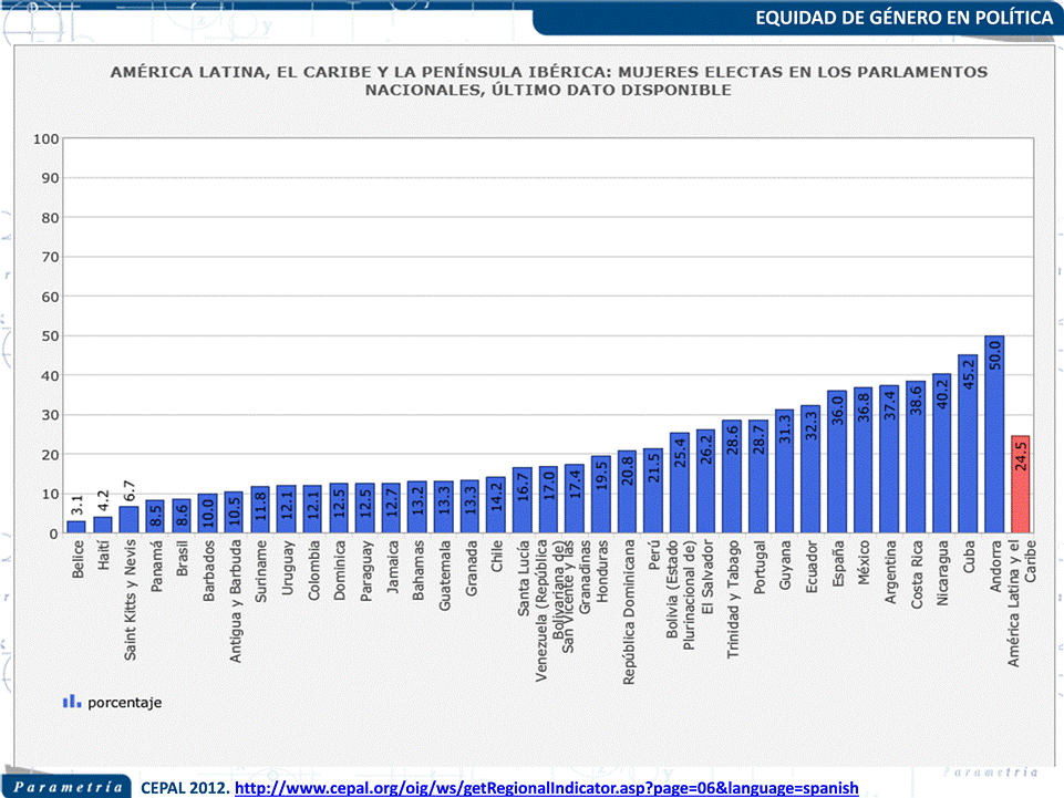De acuerdo con datos de 2012, de la Comisión Económica para América Latina y el Caribe (CEPAL), México cuenta con un 36.8 % de mujeres electas en el congreso nacional, el porcentaje es superior a lo registrado en: Brasil, Uruguay, Colombia, Chile, incluso España y Portugal, no obstante nos encontramos por debajo de Argentina, Costa Rica y Nicaragua.
