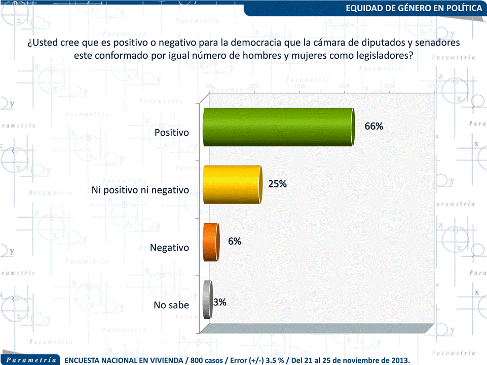 Además de estar de acuerdo con las cuotas de género, siete de cada diez entrevistados (66 %) considera positivo para la democracia el que la cámara de diputados y senadores estén conformadas por igual número de hombres y mujeres como legisladores, para 25 % el evento no es ni positivo ni negativo y únicamente 6 % consideró este escenario como negativo.