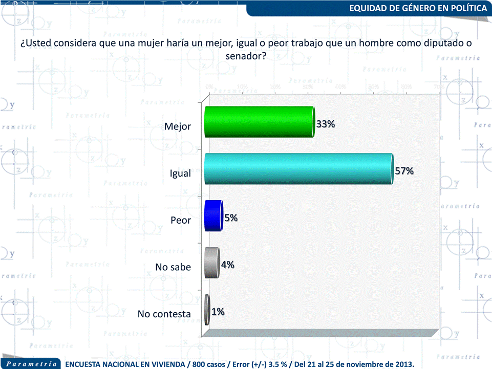 Otro dato importante que llama la atención es que más entrevistados (57 %) consideran que una mujer haría un trabajo igual al de un hombre al ser diputada o senadora, incluso 33 % dijo que una mujer desempeñaría mejor estos cargos públicos, únicamente 6 % señaló que las personas de sexo femenino podrían hacer un peor trabajo como legisladoras en comparación con los hombres.