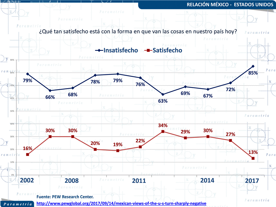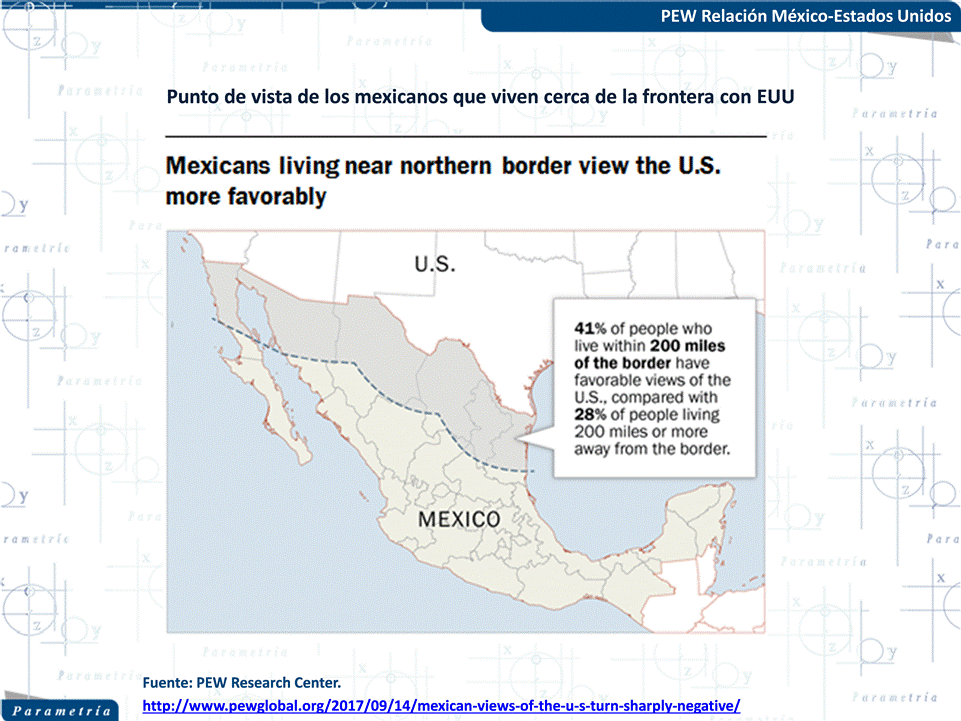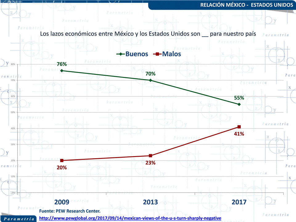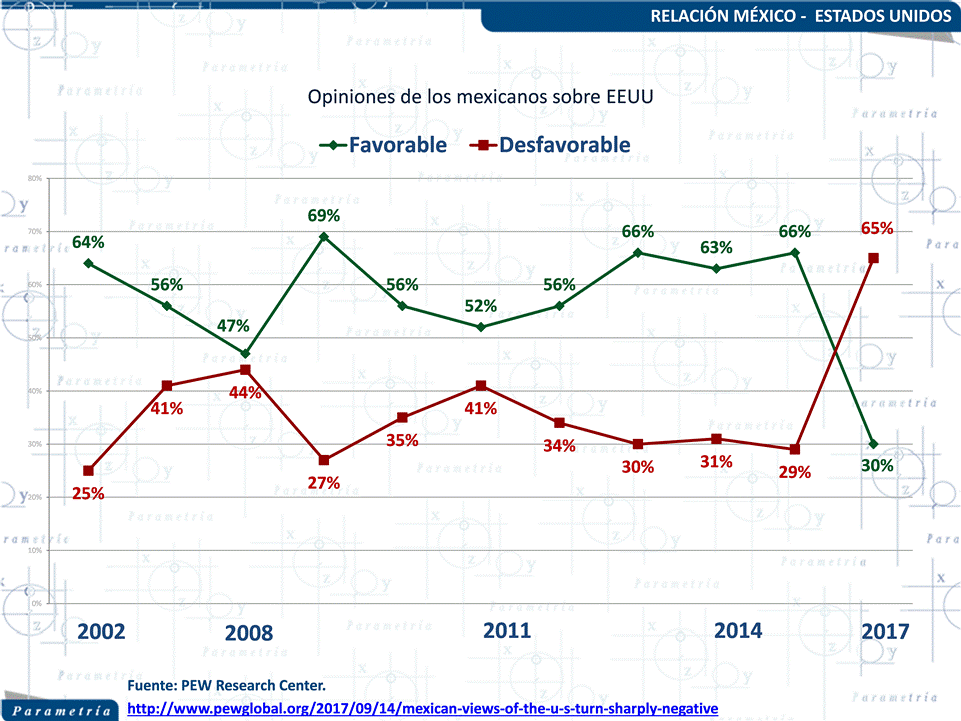 La encuesta hecha en vivienda por dicha institución, la cual tuvo lugar del 2 de marzo al 10 de abril de 2017, muestra que el 65% de mexicanos tiene una mala opinión del país vecino, mientras que sólo 30% manifiesta tener una opinión favorable. En los últimos 15 años no se había registrado este tipo de escenario. Si bien en 2008 hubo un repunte de opiniones negativas de los mexicanos hacía Estados Unidos, -motivadas posiblemente por la crisis económica de ese año- no hubo un porcentaje tan alto de puntos de vista desfavorables como el que vemos ahora.
