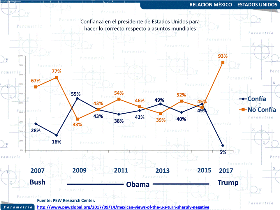 A estos datos se debe agregar un 93% de mexicanos que manifiesta tener poco o nada de confianza en que el actual presidente de Estados Unidos, Donald Trump, pueda hacer lo correcto respecto a asuntos mundiales. Ninguno de los dos expresidentes norteamericanos (Obama y Bush) había generado tan poca confianza entre los mexicanos sobre su capacidad para afrontar asuntos de corte internacional, incluso Bush en el contexto de la guerra emprendida en Irak tenía mejores porcentajes.
