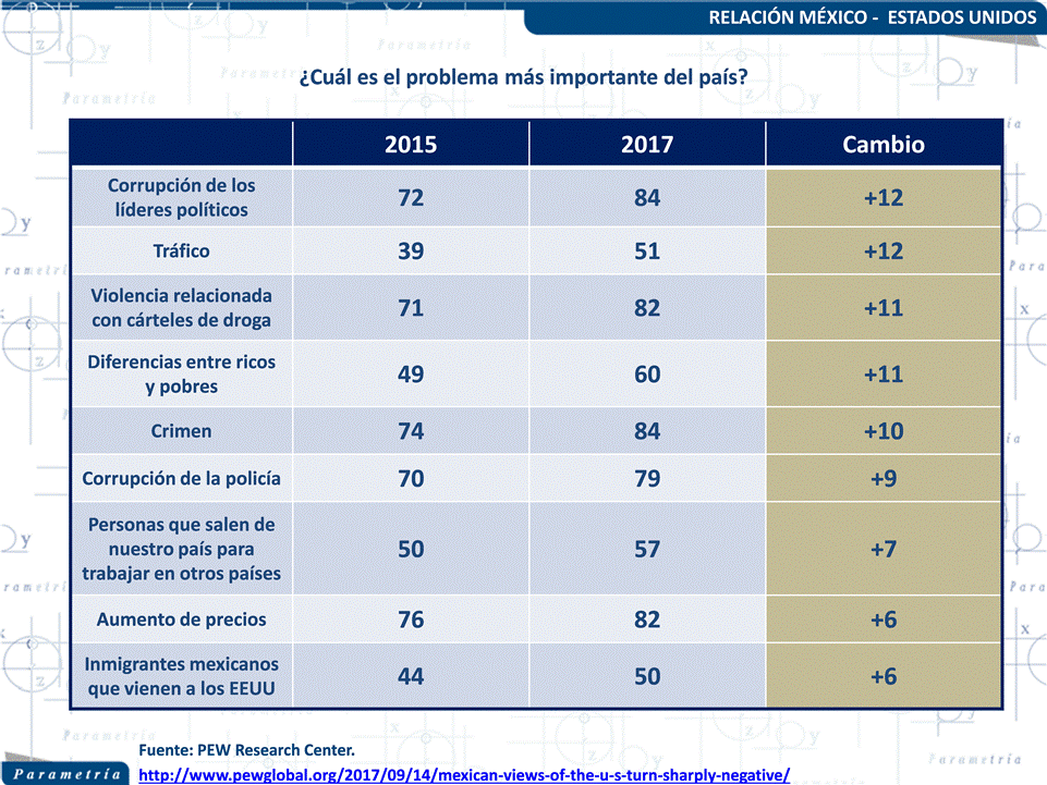 El reporte del PEW Reseach Center muestra datos que ya otras consultoras del país hemos mencionado, uno de ellos es al aumento del porcentaje de mexicanos que consideran que la corrupción es uno de los principales problemas del país, sin embargo, la riqueza del estudio es que pone énfasis en nuestra relación con el país vecino, pues si bien se registran porcentajes históricos de desaprobación del gobierno de EEUU, ese país sigue siendo para los mexicanos una opción para mejorar su calidad de vida.