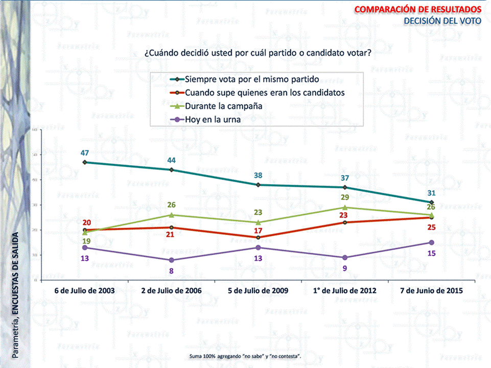 La caída de la intención de voto por el PRI como partido es histórica. A tal distancia de las elecciones sin la nominación de un candidato el partido en el poder a nivel federal nunca se había ido a la tercera posición. El partido en el gobierno como tercera fuerza electoral no sólo es un evento inusual, es histórico.