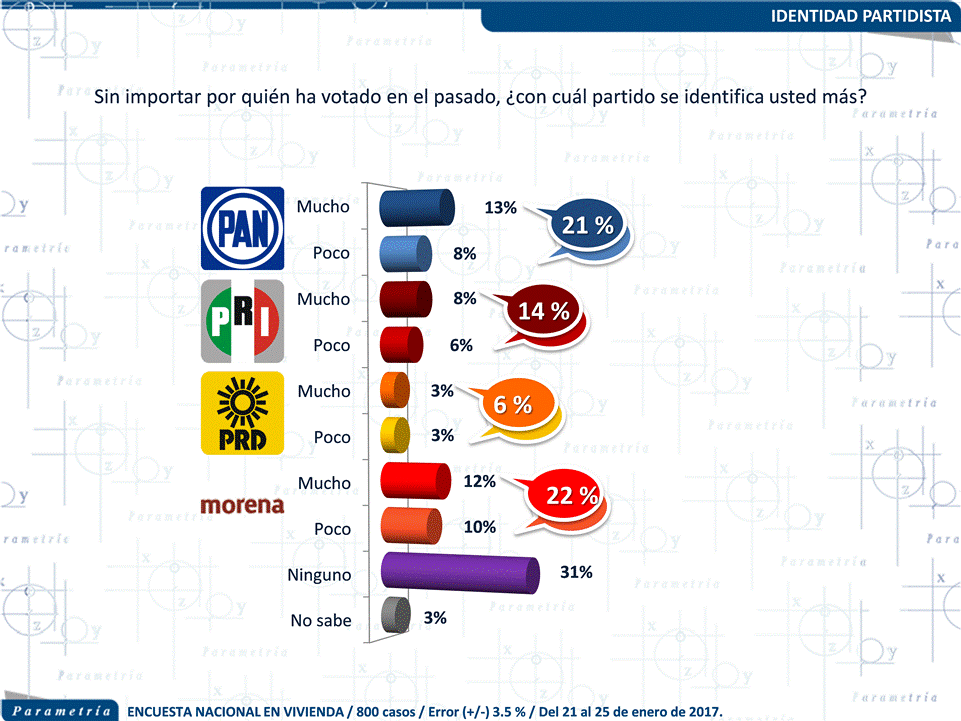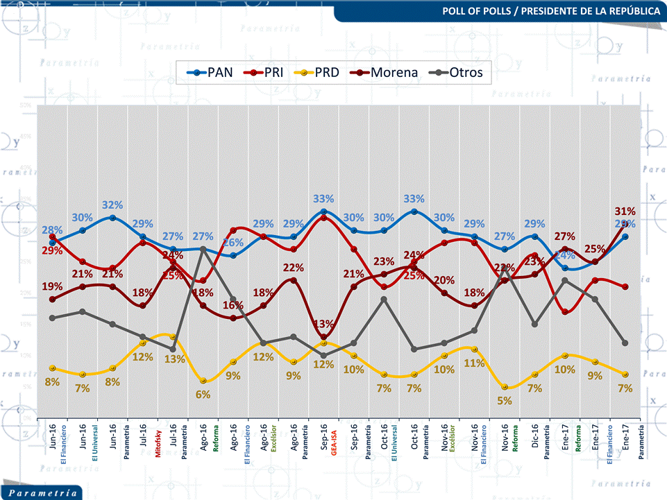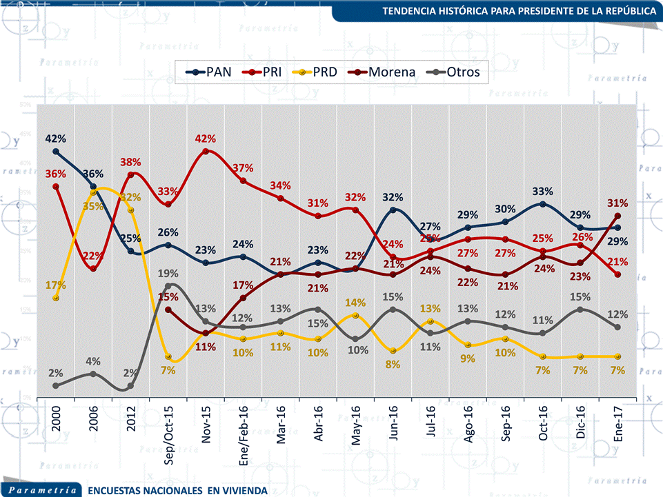 En octubre ya había empatado al PRI, y durante diciembre de 2016 y enero de 2017 lo rebasó. Este lento crecimiento de Morena culminó en sobrepasar no sólo al PRI, sino al PAN que se había colocado como la primera fuerza electoral desde junio. La última medición de Parametría indica que la distancia entre Morena y el segundo lugar (PAN) es de dos puntos porcentuales -31% vs 29%- y hay diez puntos de distancia con el PRI, quien llega a 21%.