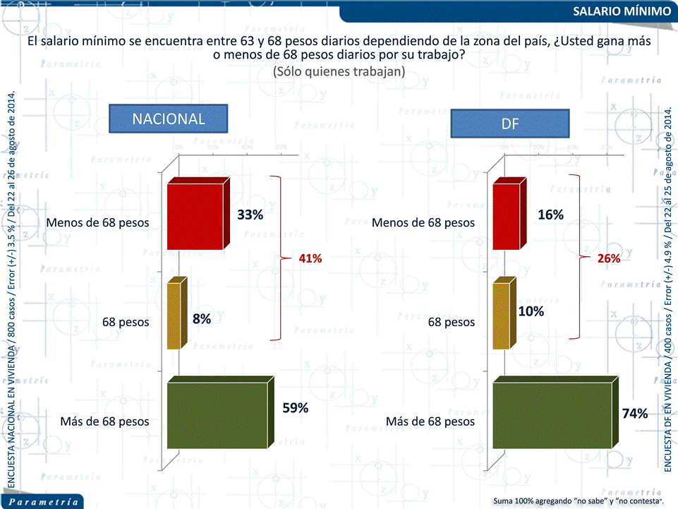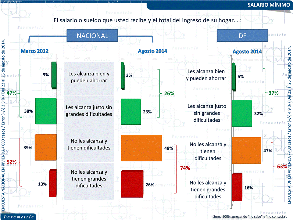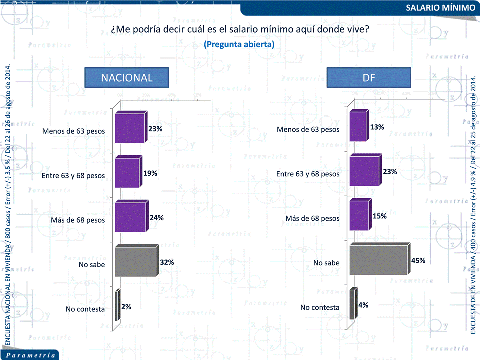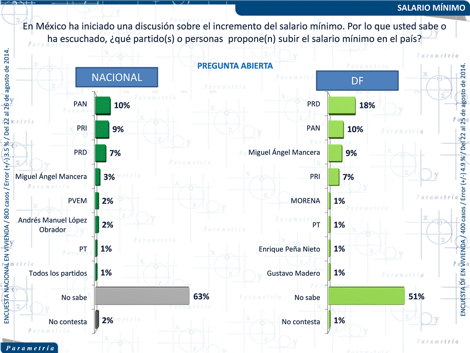 PARAMETRÍA. Encuesta Nacional en vivienda. Representatividad: Nacional. Número de entrevistas: 800 encuestas realizadas del 22 al 26 de agosto de 2014. Nivel de confianza estadística: 95 %. Margen de error: (+/-) 3.5 %. Tasa de rechazo: 49%. Diseño, muestreo, operativo de campo y análisis: Parametría SA de CV. Método de muestreo: Aleatorio sistemático con probabilidad proporcional al tamaño. Unidad de muestreo: Las secciones electorales reportadas por el INE. Población objetivo: Personas de 18 años en adelante con credencial para votar que al momento de la entrevista residan en el lugar de interés.