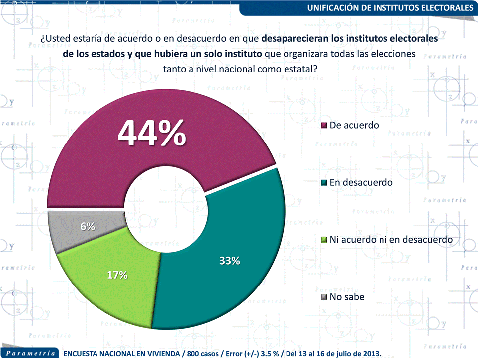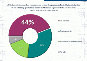 En la opinión pública, la idea de unificar los institutos estatales en un solo organismo electoral es apoyada por cuatro de cada diez mexicanos. El estudio en vivienda realizado en julio por Parametría, muestra que casi la mitad de la población (44 %) está de acuerdo con la desaparición de los institutos electorales estatales y con la creación de un instituto único que organice las elecciones federales y estatales. Tres de cada diez entrevistados rechazan la iniciativa (de reemplazar al IFE y a los 32 institutos estatales electorales) anunciada por el PAN desde mediados de mayo[6] y sólo dos de los encuestados (17 %) optaron por no tomar postura al respecto.