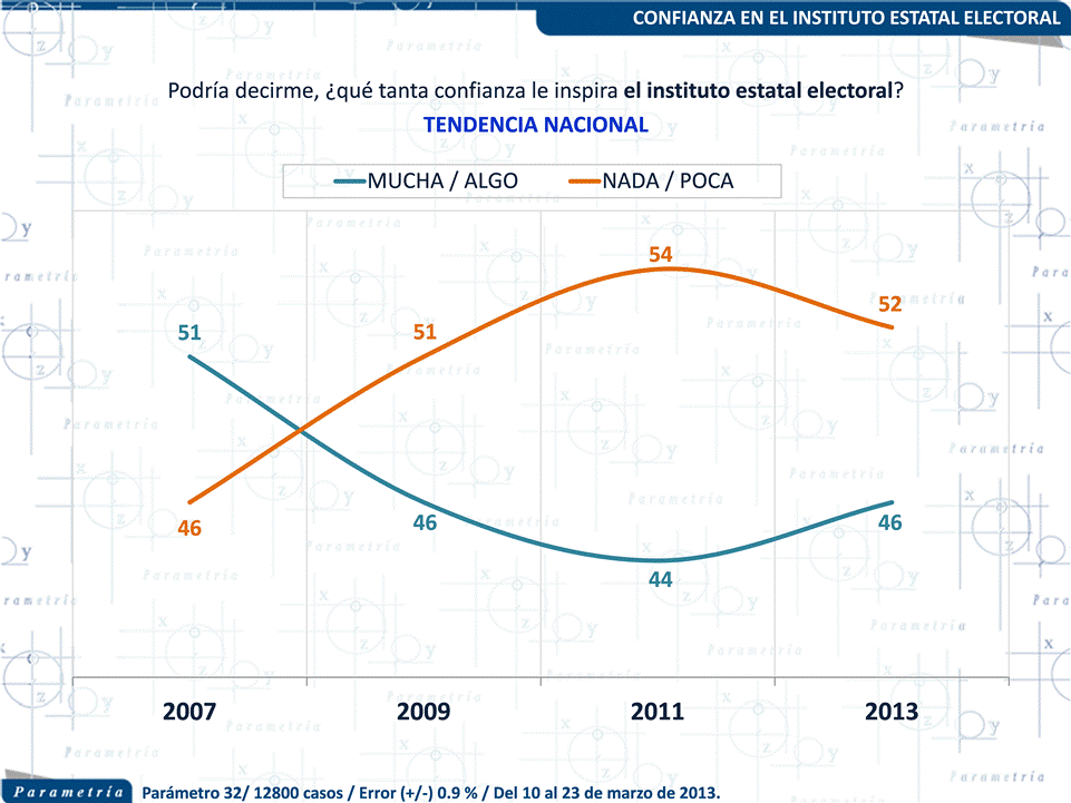 PARÁMETRO 32. Encuesta Nacional en vivienda. Representatividad: Nacional. Número de entrevistas: 12800 encuestas realizadas del 10 al 23 de marzo de 2013. Nivel de confianza estadística: 95 %. Margen de error: (+/-) 0.9 %. Diseño, muestreo, operativo de campo y análisis: Parametría SA de CV. Método de muestreo: Aleatorio sistemático con probabilidad proporcional al tamaño. Unidad de muestreo: Las secciones electorales reportadas por el IFE. Población objetivo: Personas de 18 años en adelante con credencial para votar que al momento de la entrevista residan en el lugar de interés.