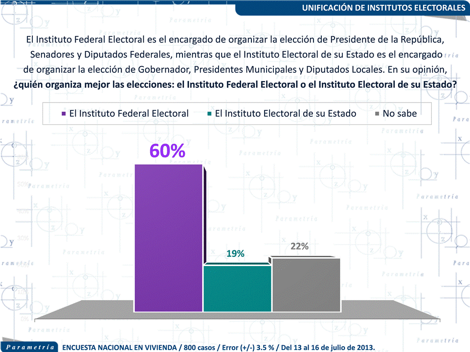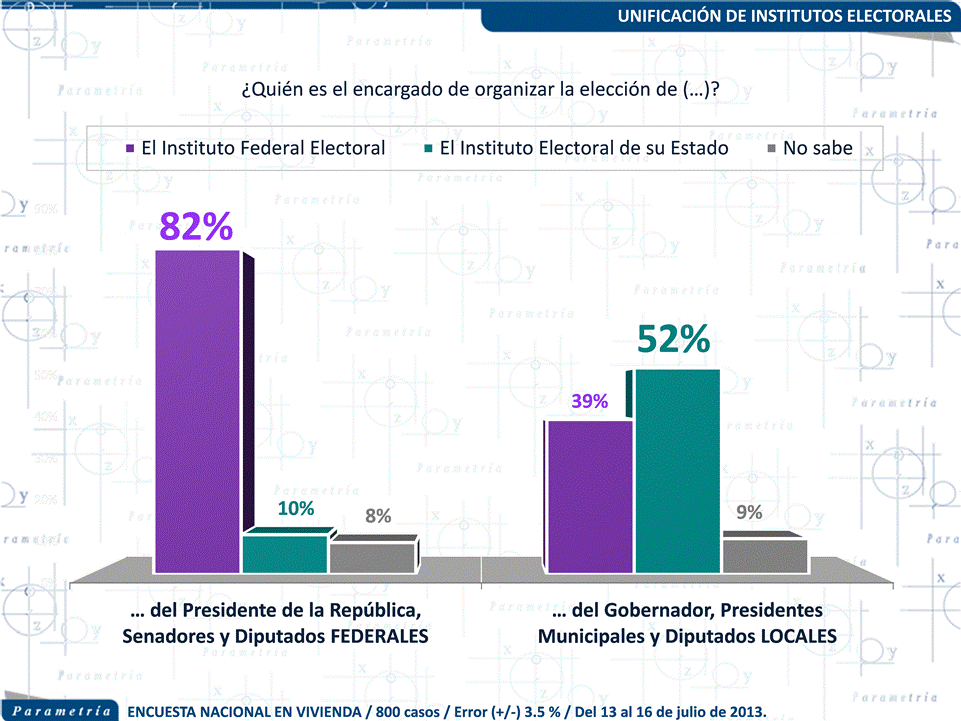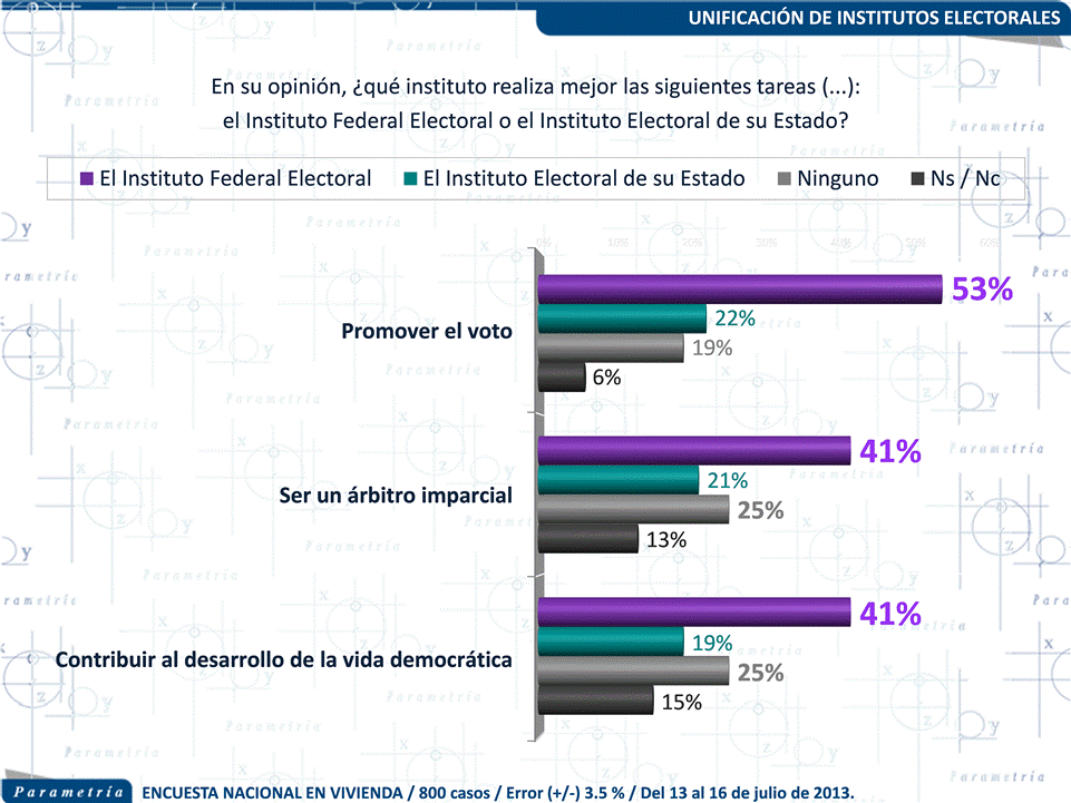 PARAMETRÍA. Encuesta Nacional en vivienda. Representatividad: Nacional. Número de entrevistas: 800 encuestas realizadas del 13 al 16 de julio de 2013. Nivel de confianza estadística: 95 %. Margen de error: (+/-) 3.5 %. Diseño, muestreo, operativo de campo y análisis: Parametría SA de CV. Método de muestreo: Aleatorio sistemático con probabilidad proporcional al tamaño. Unidad de muestreo: Las secciones electorales reportadas por el IFE. Población objetivo: Personas de 18 años en adelante con credencial para votar que al momento de la entrevista residan en el lugar de interés.