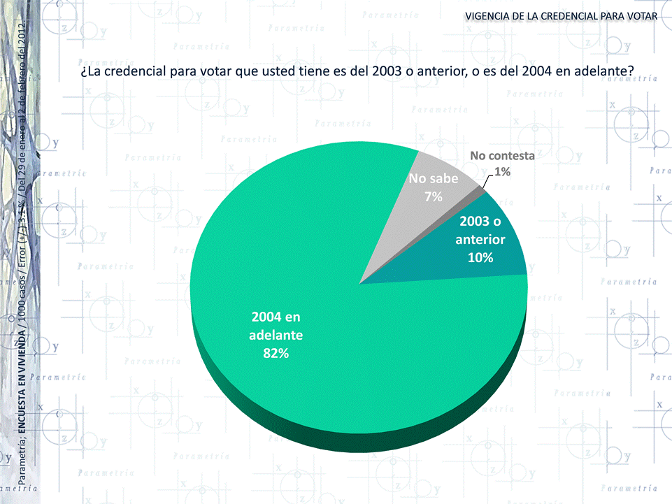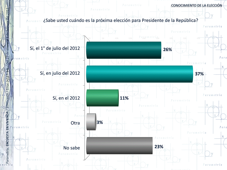 PARAMETRÍA. Estudio: Encuesta Nacional en vivienda. Representatividad: Nacional. Número de entrevistas: 1000 encuestas. Del 29 de enero al 02 de febrero de 2012. Nivel de confianza estadística: 95%. Margen de error (+/-) 3.1%. Diseño, muestreo, operativo de campo y análisis: Parametría SA de CV. Método de muestreo: Aleatorio sistemático con probabilidad proporcional al tamaño. Unidad de muestreo: Las secciones electorales reportadas por el IFE.