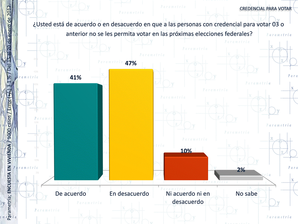 - A mediados de enero de 2012, cuando venció el plazo para renovar las credenciales 03 del IFE, 47% de los entrevistados estaba en desacuerdo con que a las personas con dicha credencial no se les permitiera votar en las elecciones de julio próximo.